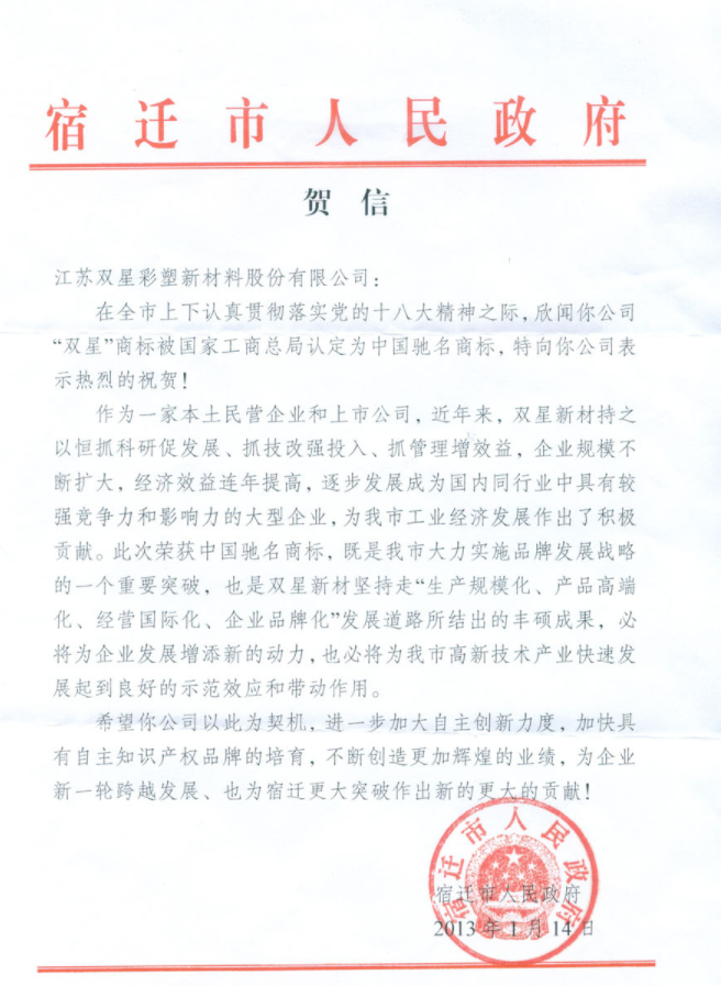 A congratulatory letter from Suqian Municipal People's Government