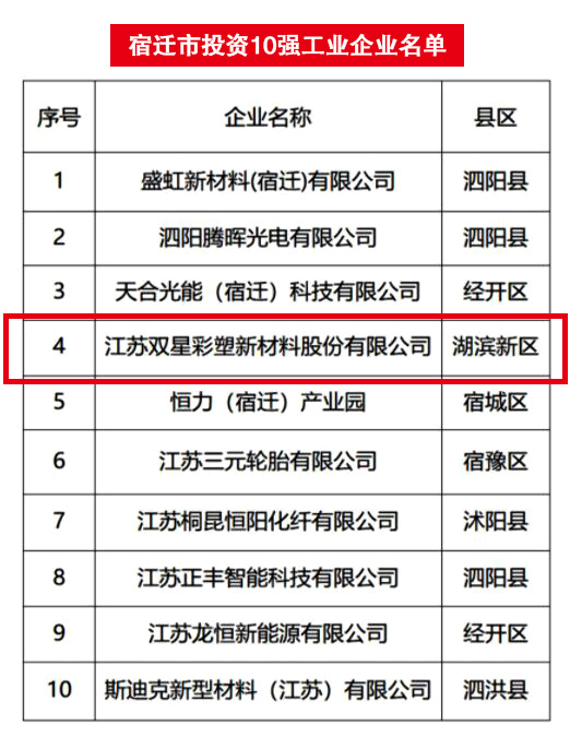 2022年2月18日,全市加快工業經濟高質量發展暨招商引資大會上,公布了2021年度“宿遷市貢獻10強、投資10強、銷售10強”工業企業名單,雙星新材喜獲“貢獻10強位列第5名、投資10強位列第4名、銷售10強位列第7名”。