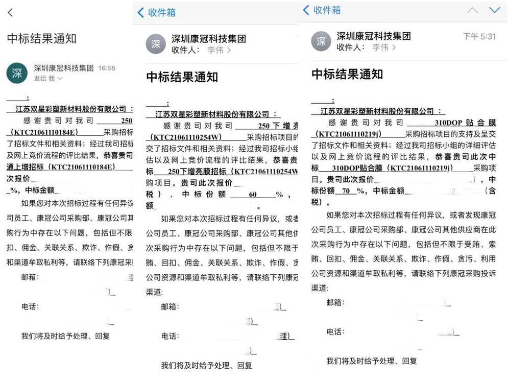 2021年6月11日我公司參加深圳康冠科技集團招標會,公司三款光學膜片產品:250下增亮膜、250上增亮膜和310DOP貼合膜喜獲中標。此次中標的各款產品分別獲得康冠科技該款產品60%-70%市場需求份額,為推進公司光學膜片發展和“99.666工程起到積極作用。