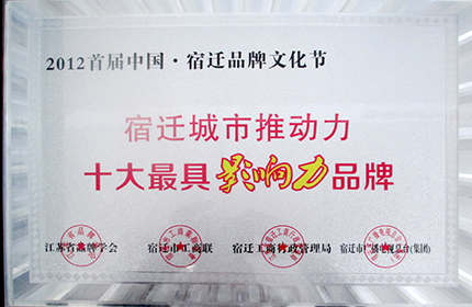 12年8月23日,由江蘇省品牌學會、宿遷市工商聯(lián)、宿遷工商行政管理局及宿遷市廣播電視總臺(集團)聯(lián)合共同舉辦的“2012首屆中國?宿遷品牌文化節(jié)”,公司“雙星”品牌被評為“宿遷市城市推動力十大最具影響力品牌”。